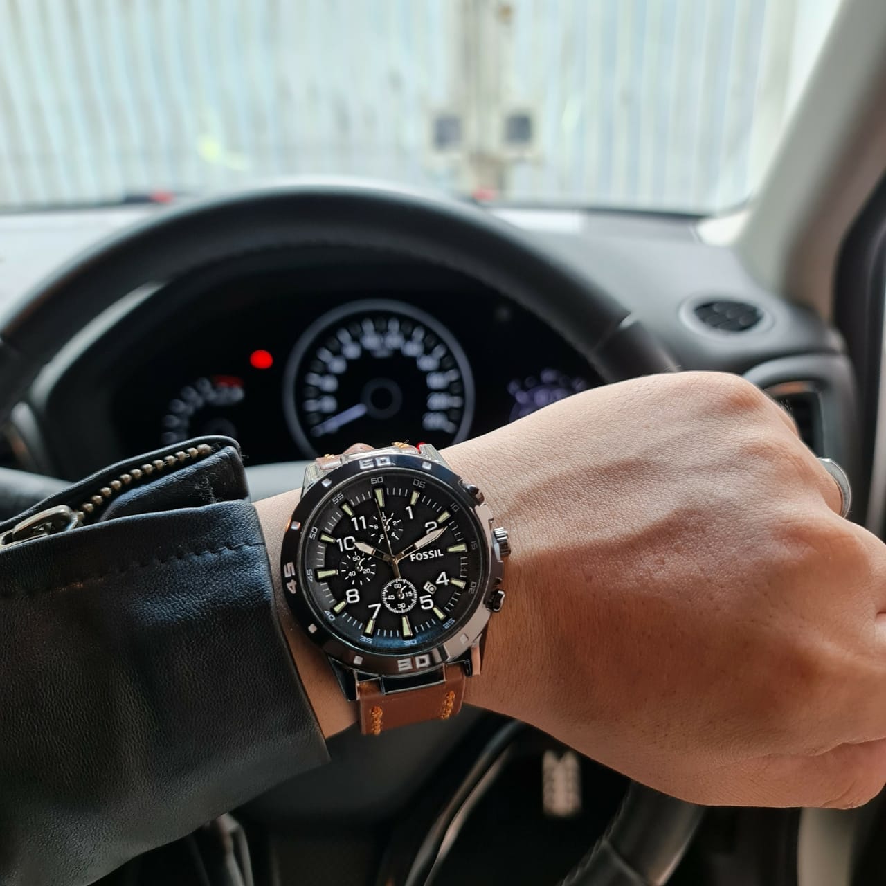 Nurarloji Jam Cowok Fossil Analog/Jarum Kulit Tanggal Aktif Chrono Detik
